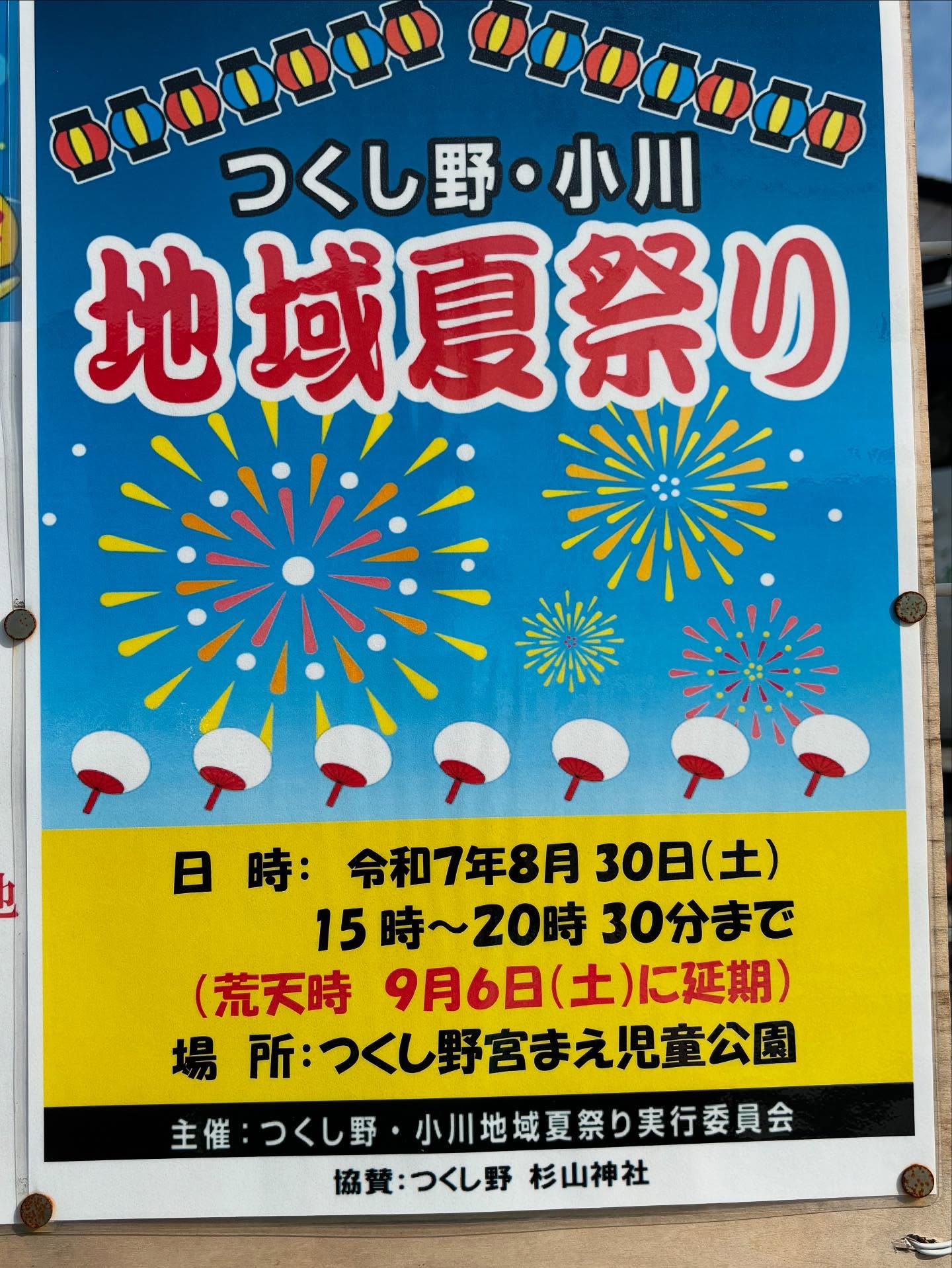 つくし野杉山神社 華月日記 2025.08.30(土) おはようございます。 今日はつくし野杉山神社の地域夏祭りのお知らせです。 華月は久しぶりの出店になりますが15時から開始です。 だんご、酒まんじゅう、どら焼き販売します。 暑くなりそうですがお待ちしております~